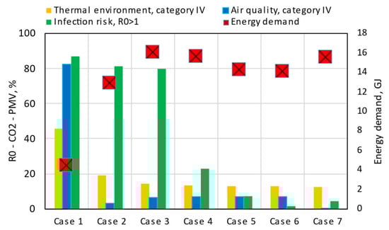 This study also examined energy demand for heating as a consequence of window opening. Figure 13 shows a summary of the unfavorable indoor environment conditions observed for each studied case together with the heat demand. The lowest demand was noted for the reference case (Case 1) in which the controller opened the window only during break times. This case, however, had the most undesirable conditions in terms of low air quality and high probability of infection transmission, which is discussed in previous sections. The introduction of the smart windows with optimized indoor air parameters (Case 2) improved air quality conditions in the classroom, but a substantial increase in heating demand was indicated (about 190%).