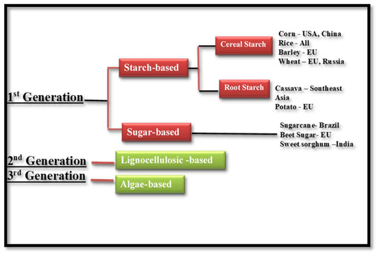 These inorganic materials act as a barrier to the thermal conversion process, and fermenting is frequently a better technique to transform this biomass fuel. To supply ethanol, starch and carbohydrates are employed as first-generation raw materials. In 2013, about 90% of bioethanol was created from starch and carbohydrate. Major crops include corn, grain, and cassava (Figure 4). The degradation of the environment during crop cultivation and ethanol production as well as the exploitation of vital food resources as fuel production are disadvantages. As a result, significant agricultural countries such as the United States, Brazil, and China are currently major producers of biofuels, including alcohol fuels. In the United States, 95% of ethanol is derived from starch [52].