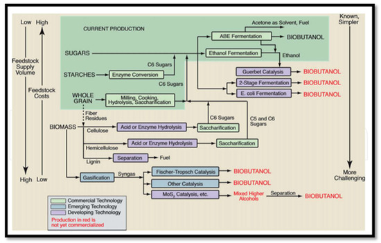 In addition to these shortcomings, ethanol can also reduce local air quality, thereby endangering human health. Compared with ethanol, butanol is a more promising choice [36,38,39]. For carbon atoms, the atoms can form a straight or branched chain [40]. The more carbon atoms, the higher the energy content of the alcohol fuel. In addition, compared with ethanol, butanol has less toxicity and higher energy consumption [36,41]. It can also be made from cellulose waste from agricultural products or even fibre residue from sugar factories [42,43].