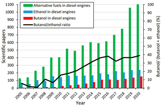 Today, the scientific community is showing increasing interest in studying n-butanol as part of the mixture. Compared with ethanol, the safety of biobutanol in fuel transportation, processing, and storage [93] as well as its higher cetane index [94], higher calorific value [95], lower volatilization [96], higher flash point, improved lubricity [90], and better compatibility with diesel fuel (especially at low temperatures) have contributed to this interest. A summary of the some physical and chemical properties of alcohols fuels are listed in Table 1. Fernández-Rodrguez et al. [97] investigated and discovered, as in Figure 5 below, which shows scientific publications published in the previous few years linked to various fuels in diesel engines, ethanol in diesel engines and butyl alcohol in diesel engines. Schematic Diagram 5 demonstrates that the scientific community is aware of the eye-catching opportunities and situations resulting from the use of biofuels in diesel engines in road freight transportation, agricultural applications, such as tractors, harvesters, and self-propelled sprinklers, as well as cogeneration applications. Furthermore, Figure 5 indicates the growing interest in n-butanol as a mixing element for diesel engines, as evidenced by a growing number of papers in recent years.