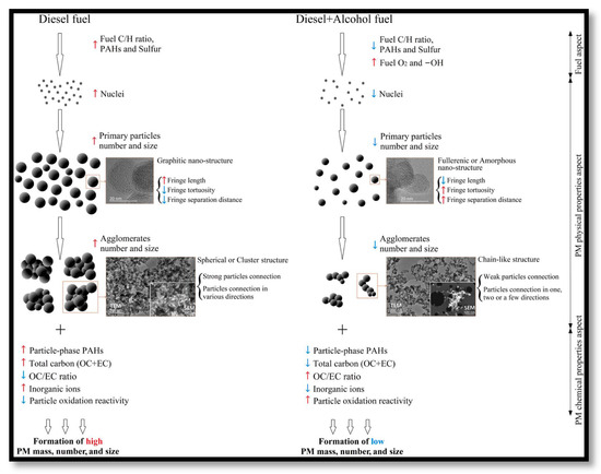 The physical properties of the particles in this study are related to the quality, quantity, and size of the particles, the microstructure and agglomerates of the particles, and the nanostructure of the primary particles. Particulate matter is composed of soot and other liquids or solids, and soot accounts for the largest part of diesel particulate mass. Soot is usually a solid that contains carbon as a byproduct of fuel combustion. Various processes include fuel pyrolysis, nucleation, coalescence/cohesion, surface growth, coalescence, and oxidation. The first five steps from fuel pyrolysis to agglomeration must be carried out in sequence, and the oxidation process can be carried out at any time during the soot formation process [103].