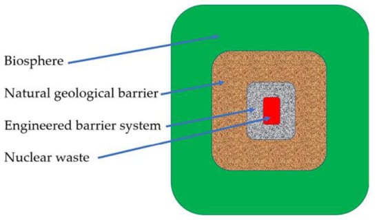 The isolation of radioactive waste (RW) at disposal facilities is ensured mainly by the implementation of the multiple-barrier principle [1,2]. Its essence is to create a number of obstacles to the potential migration of radionuclides into the environment, allowing the process to be significantly delayed or completely stopped [1,3,4]. A multiple-barrier protection system typically consists of a host rock of the disposal facility and its surroundings (geological barrier) called the natural barrier system (NBS) and an engineered barrier system (EBS) (Figure 1) [1,2]. The composition of the engineered barrier system is formed mainly of the following parts: waste form, containers with waste, borehole or tunnel lining, sealing, plugging, backfilling and construction of RW disposal facility walls [1,2]. Near-surface disposal facilities (NSDF) and near-surface repositories of radioactive waste (NSR) mainly rely on EBS, while geological disposal facilities (GDF) and deep geological repositories of RW (DGR) use NBS [1] as the main barrier.