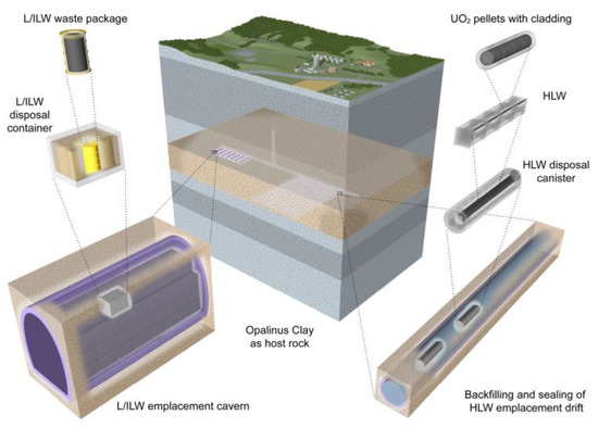 In the Belgian repository project [24], it is planned to dispose long-lived high-, intermediate- and low-level radioactive waste at a depth of 230–240 m in boom clays.