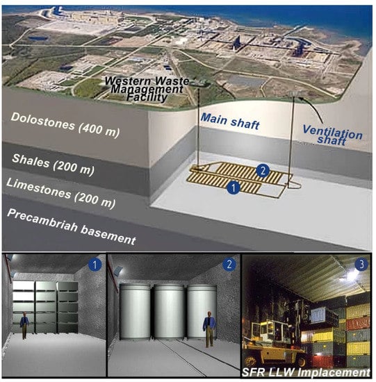 - Gierszewski, P. Overview of Ontario Power Generation’s Proposed Deep Geologic Repository for Low & Intermediate Level Waste at the Bruce Site, Ontario, Canada-8517. 2008. Available online: https://archivedproceedings.econference.io/wmsym/2008/pdfs/8517.pdf (accessed on 15 October 2022).