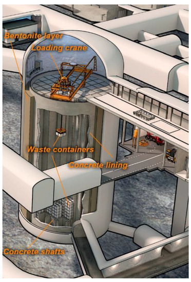 After the end of the operation of the disposal site, the waste tunnels will be sealed with bentonite and concrete blocks (Figure 8) [25].