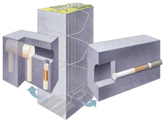 The KBS-3 concept provides for isolation of high-level waste [46] and spent nuclear fuel [47] in crystalline host rock [48]—granite [49]. Two variants of radioactive waste containers emplacement are considered, the schematic of which is shown in Figure 10—vertical in boreholes (KBS-3V) and horizontal in tunnels (KBS-3H) [33,49,50].