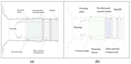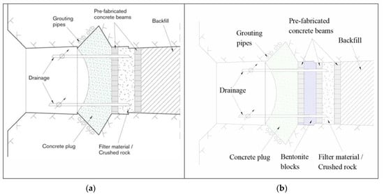 Design of short reinforced concrete plug without (a) and with an intermediate bentonite layer (b) between the filling of the tunnel and the plug itself [49].