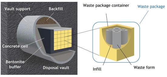 Disposal of low- and intermediate-level waste in Switzerland will be carried out in geological formations of host rock formed from opalinus clay and/or clayey limestone. The intermediate- and low-level waste are isolated in solid form by means of cementing, bitumizing or alloying in a plasma furnace into a slag-like mass [25,39]. The waste is isolated in metal barrels, which are placed in a concrete container filled with cement mortar (Figure 5).