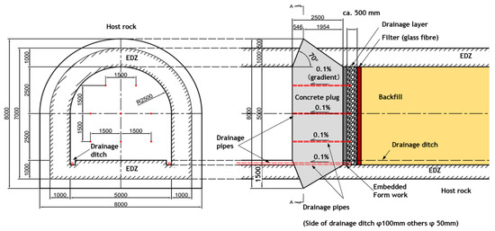 Based on the experimental reports of the Äspö [54,55,56] hard rock laboratory, SKB has opted for a short reinforced plug with an intermediate layer of bentonite. The use of low-alkaline concrete is explained by the need to preserve the bentonite buffer’s previous swelling ability, which is severely degraded in the strong alkaline solutions formed by filtering underground water through concrete structures [49].