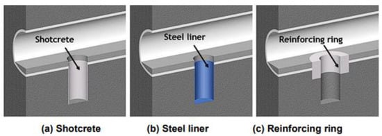 Tunnels for intermediate- and high-level waste placement in the Cigéo geological disposal facility [38] are planned to be supported from the inside by the application of shotcrete on the walls with additional strengthening in the form of various reinforcements, after which the tunnel is cladded with non-reinforced concrete (Figure 7).