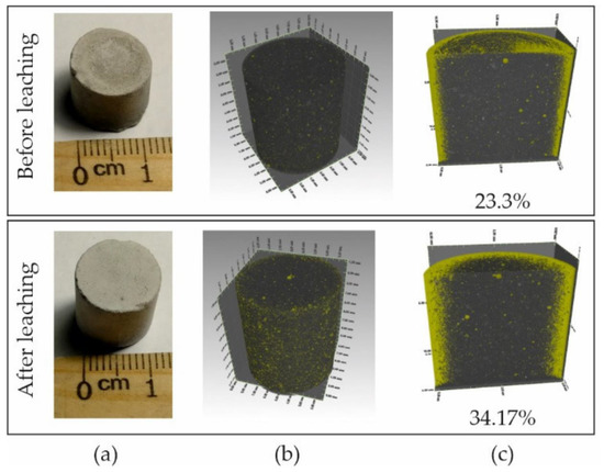 - Low compressive strength of the material (4.9, 5.9 and 6.3 MPa on 7, 28 and 90 days of curing, unlike OPCs under almost identical conditions—31, 45 and 46 MPa on 7, 28 and 90 days, respectively [30,31]) to create a potential recovery of waste packages [28];