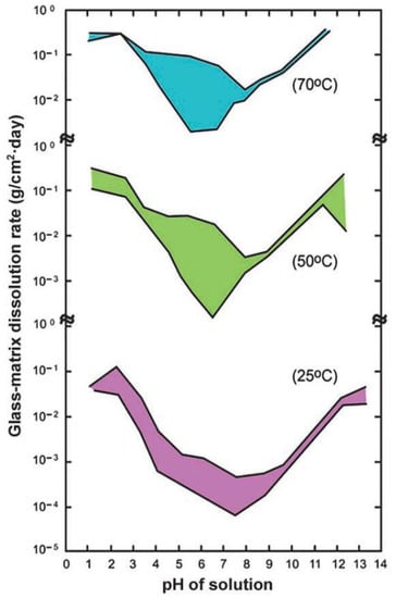 - Cassingham, N.; Corkhill, C.L.; Backhouse, D.J.; Hand, R.J.; Ryan, J.V.; Vienna, J.D.; Hyatt, N.C. The Initial Dissolution Rates of Simulated UK MagnoxTh ORP Blend Nuclear Waste Glass as a Function of pH, Temperature and Waste Loading. Mineral. Mag. 2015, 79, 1529–1542. [Google Scholar] [CrossRef]