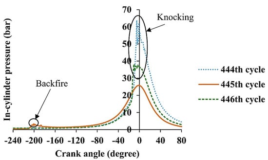 Knock, which is regarded as one of the abnormal combustions in engines [], causes significant pressure fluctuations in the combustion chamber, which adversely affects the engine’s performance and potentially causes irreparable mechanical damage []. According to research and the Motored Octane Number, hydrogen can be regarded as a superior anti-knock fuel; yet, under identical operating conditions, HICEs often exhibit greater knock than ICEs powered by gasoline []. According to Dhyani et al. [], knock in HREs raise engine component temperatures, which might result in hot spots and severe backfire in succeeding cycles and is undesirable to the engine’s stability. Figure 2 shows the correlation between backfire and knocking. The combustion analysis was carried out by the authors on a cyclic basis in order to investigate backfire at various equivalency ratios. The combustion conditions were examined using the recorded in-cylinder pressure-crank angle data from each cycle as input. The cycle-based analysis was performed at an equivalent ratio of 0.82 to determine the backfire occurrence. A rapid fluctuation in pressure at the end of the compression stroke in the 444th cycle indicates a high-intensity knock. Backfire was observed during the suction stroke in the 445th cycle, causing the peak pressure to drop to 25 bar. The 446th cycle had knocking without a backfire. As additional cycles passed, the knock level steadily rose until the engine stopped on the 490th cycle.