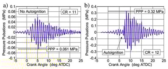 Comparison between weak knock and strong knock (Szwaja and Naber []). (a) the pressure pulsations start at 0°. (b) indicates pressure pulsation condition during combustion at CR = 12.