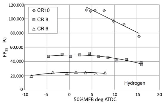 In contrast to conventional fuel, the knock of a hydrogen engine is caused by the mutual development of flame and pressure wave rather than the end mixture spontaneously igniting []. Salvi et al. [] reported that as the equivalence ratio increases, an HRE is more prone to knock. Szwaja [] found that knock level has a direct relation with the combustion rate in HICEs. The knock intensity for the ninety-fifth percentile of peak pressure vs. the maximum rate of mass fraction burnt at three different compression ratios is shown in Figure 4. At a compression ratio of six, the knock is minor. When the compression ratio reaches eight, the knock is significant, but it does not intensify and affect the engine as the spark timing advances. A considerably high knock of approximately 100 kPa occurred at a compression ratio of 10. The knock increases rapidly as the 50% mass fraction burnt approaches the top dead center (TDC), which corresponds to advancing spark timing.