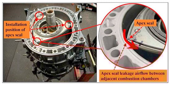 The fuel injection method of a peripheral-ported natural gas blended with hydrogen in an RE under the action of apex seal leakage was investigated by Fan []. Fluid flow and flame propagation in an RE can be significantly altered by the apex seal leakage []. Additionally, the apex seal leakage to a greater extent affects the motion of the air fuel mixture and the burning process in REs []. The high temperature and high pressure fluid in the combustion chamber leaks through the clearances into the adjacent chambers (as shown in Figure 8), directing the flame movement towards the compression chamber [].