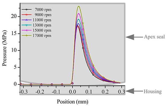 In a one-dimensional simulation analysis, the volumetric efficiency and peak pressure of REs are drastically reduced due to the apex seal leakage []. Additionally, the greater the apex seal leakage, the shorter the time span of the choked flow []. The leakage comparison between hydrogen and air by Hsieh [] shows that a greater vortex number of hydrogen than that of air results in a greater risk of leakage by using hydrogen as fuel as compared to air. According to research on the impact of apex seal leakage on NOx emissions, final NOx concentrations significantly decrease as apex seal leakage area increases. In addition, the rise in HC content at low engine rpm is mostly caused by apex seal leakage []. Zhang et al. [] investigated the variation in oil film thickness between the apex seal and the epitrochoidal housing of a rotary engine at various operating speeds (7000, 9000, 11,000, 13,000, 15,000, and 17,000 rpm). The apex seal leakage considerably alters gas pressure, further affecting the oil film thickness. Figure 9 depicts the pressure distribution of oil films. The leading arc has a relatively higher oil film pressure than the trailing arc. The maximum pressure value increases significantly as the crank angle turns. Because of the periodic change in gas pressure in the leading and trailing chambers, the apex seal moves laterally. As a result, the gas pressure varies drastically with lateral movement, and the abrupt change of gas pressure affects the pressure distribution.