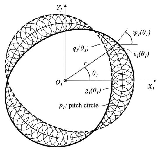 Until 2013, rotary engines were designed using trochoidal type housing profile, while spring loaded apex seals were employed to seal the chambers at the rotor apexes. Rose and Yang for the first time developed the design of rotary engines based on the apex seal profile deviation function (DF) approach of conjugate pair design. Using this method, the engine housing is constructed conjugate to the apex seal while the conformity between housing and the seal improves the sealing ability and efficiency, thus improving the engine efficiency. In addition, the load at the apex seals can be minimized, thus improving the friction losses on the rotor apex. Moreover, the authors designed the housing for a broader apex seal, consisting of several seals employed at each rotor apex. When each of the apex seals are in direct contact with the housing, various constraints are constructed to prevent gas leakage. Due to interference between the seals and the bore, the feasibility of wider apex seals has not been proven for conventional engines. In a subsequent study, the DF approach for engine design by apex seal profile shows best sealing between the seal and bore. They reported that the DF method allows the selection from a range of apex seal profiles and geometries, and wider apex seals have a greater sealing index [,,]. Figure 11 represents the deviation function method for drawing the envelopes of the deviation circles.