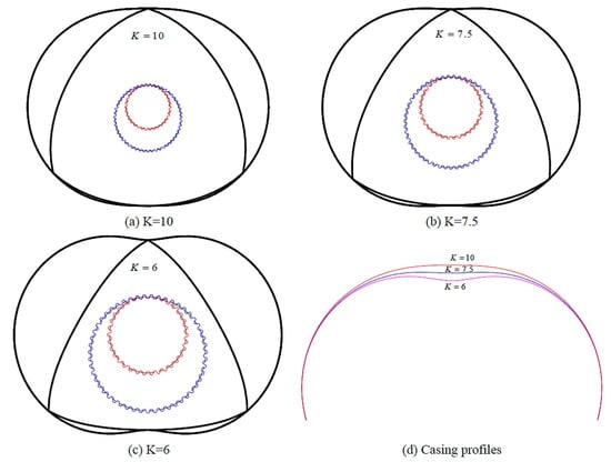 Hsieh and Cheng used CFD methods to analyze the effect of variations in the geometric design curve (K factor) on the flow characteristics of rotary engines. They found that a lower K factor produces more leakage, high internal pressure variations, and unstable inlet pressure. In contrast, a high K factor reduces the leakage followed by lower internal pressure variation, and stable inlet pressure []. Figure 12 shows the design for various K factors of REs. In Figure 12a–c, the sun gear constructed from the theoretical rolling circle is shown in blue and the fixed circle is shown in red. Based on the movement trajectory principle of points the housing curve constructed should confirm with the rotor profile such that the fixed circle rotates along rolling circle. Figure 12d presents design results of three different K factors analyzed. The small K factor (K = 6) is shown in pink color, the medium K factor (K = 7.5) is shown in blue color and the large K factor (K = 10) is shown in red color.