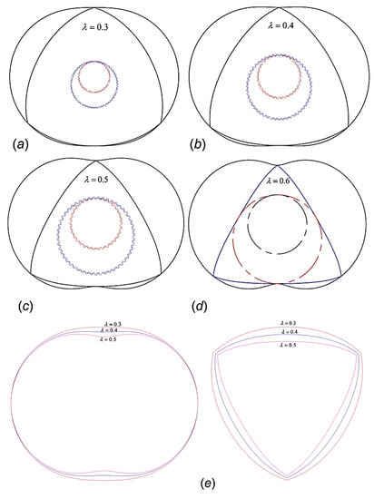 Hsieh, in a recent study, has proposed chamber profiles and triangular rotor profiles in an RE. Using the epitrochoid and envelope concepts for the dynamic analysis of the kinematics and stresses at the apex seals, it was found that a higher trochoid ratio decreases system stability and raises vibrations, stress variations, and stress intensity. When taking into account combustion chamber displacement, compression ratio, operation stability, and parts load capacity, the trochoid ratio of 0.4 is recommended []. The theoretical profile design results for various trochoid ratios are presented in Figure 13. Figure 13a–c shows the sun gear constructed from the theoretical rolling circle shown in blue and the fixed circle shown in red for trochoid ratio λ = 0.3, 0.4 and 0.5 respectively. Figure 13d shows the sun gear constructed from the theoretical profile for trochoid ratio λ = 0.6, which means the internal gears are not feasible and thus for production the trochoid ratio is proposed to be less than 0.6. Figure 13e presents design of housing and rotor profile for three different trochoid ratios. The large, medium and small trochoid ratios (λ = 0.5, 0.4, and 0.3) are shown in pink, blue and red color respectively.