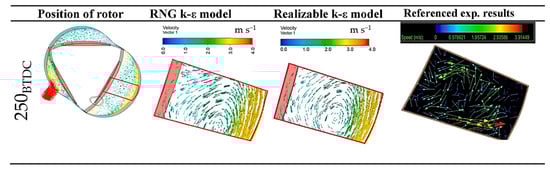For computational modeling of rotary engine, in the solution of Navier Stokes equations, the pressure implicit splitting of operators (PISO) scheme is used by researchers for pressure velocity coupling; the first order upwind scheme is used for turbulence kinetic energy and turbulence dissipation rate terms, and the second order upwind scheme is to differentiate energy, density, and momentum terms. Since turbulence modeling is important in studying the flow field calculations of the internal combustion engines, RNG (renormalization group) and realizable k-ε turbulence models were tested in validation studies of numerical calculations. Turbulence models (refer to Figure 15) tested on a rotary engine of which flow field was experimentally obtained and published by Fan et al. []. Though some researchers still use the standard k-ε model, improved versions of k-ε models were generated for special applications. For example, the RNG k-ε model is well suited to numerical simulations of ICEs, since it has a higher accuracy for vortex flow []. The RNG model, in contrast to the normal k-ε turbulence model, contains an effective viscosity component (μeff) and the following extra term (Rε) in the transport equation, which improves numerical simulations. The realizable k- model is a version of the conventional k-ε model that includes a new formulation for defining eddy viscosity and a new transport equation for the dissipation rate []. Satisfying certain constraints on Reynolds stresses, the realizable k-ε model offers consistent results with the physics of turbulent flows and more accurately predicts flow fields that have strong streamline curvature, vortices, and rotation []. Taskiran et al. [] assumed air to be at atmospheric pressure at the inlet and outlet boundaries of intake and exhaust channels. A constant temperature of 300 K and no slip conditions were set on the wall boundaries. The results of the RNG and realizable k-ε models are demonstrated in Figure 15. Though both turbulence models present very similar results, the RNG model predicts more accurately the location of rotational flow and velocity vectors. The difference between turbulence models arises at regions close to the walls as seen on trailing side of the rotor.