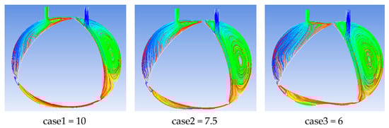 Hsieh and Cheng [], in their research, conducted a 3D simulation of an RE by setting the inlet pressure to 2 atmospheric pressure and outlet pressure to 1 atmospheric pressure while the rotation speed was 1800 rpm. It considered a turbulent model (k-ε model) and a clearance constant of 0.15 mm for apex sealing, and captured stream lines and vortex formation for three different chamber designs based on K factors (case1 = 10, case2 = 7.5, case3 = 6), as shown in Figure 16.