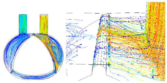 Hsieh et al. [] conducted a 3D CFD analysis using air and hydrogen as fuels to investigate the flow characteristics of RE along with leakage analysis. The rotor speed was set to 1000 rpm, the temperature to 300 K, and the inlet and outlet pressures were set to pressure 2 atm and 1 atm, respectively. The authors found that an excess of leakage occurs at the apex of rotors affecting the engine performance adversely. The stream lines indicating the flow leakage are shown in Figure 17. As the fluid flows from high pressure to low pressure zone while circulating between the chambers, a significant amount of fluid leaks to the peripheral region of the rotor due to the effect of cavity wall and rotor apex. The streamline visuals obtained from three dimensional simulation results give information regarding fluid motion and fluid flow path. The red color streamlines indicate high pressure field and blue color streamlines as low pressure field. Multiple streamlines in red color can be seen at the upper rotor apex which depict that some of the fluid gets discharged without being circulated.