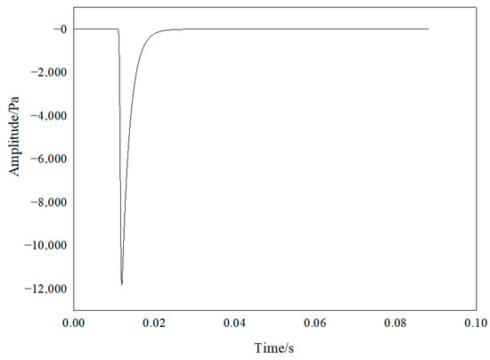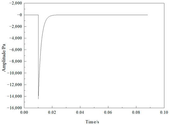 The steady-state calculation is performed firstly as the inlet pressure is 1,150,000 Pa, and the outlet pressure is 1,149,800 Pa; velocity is 5.36 m/s. After 2000 iterations, the transient calculation is carried out: the time step size is s; number of time steps is 3530; the total simulation time is 0.08825 s. After 2000 iterations, the transient calculation with pressure pulse is carried out: the inlet pressure is set as Equation (5) by UDF which can be seen in Figure 2.