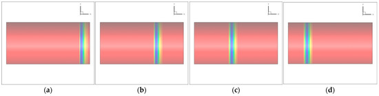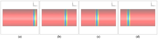Pressure distribution when the pulse propagates in the pipe (blue represents the amplitude): (a) 0.02 s, (b) 0.04 s, (c) 0.06 s, (d) 0.08 s.