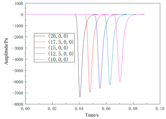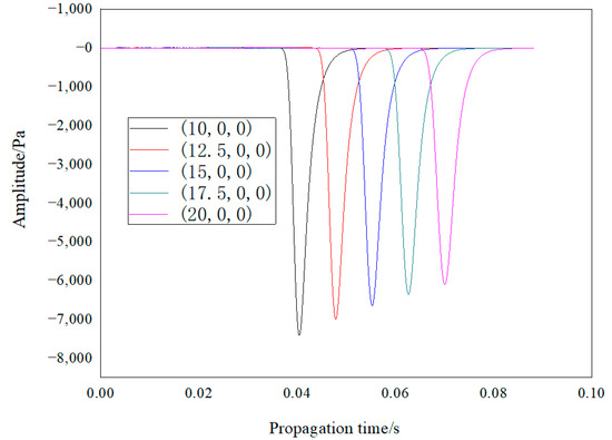 From Figure 10, the waveforms remain similar and spread, and the amplitude attenuates as the acoustic waves are in the propagation process.