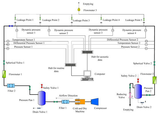 A high-pressure gas pipeline loop with leak detection system is designed and established by similarity analysis with field transportation pipelines, as seen in Figure 9. With an internal diameter of 10 mm, the length of the test pipeline is 200.70 m. Five leakage points are located where the valve and orifice plate are installed to control the leak flow rate from the orifice. The diameter of the orifice is variable with 0.10 mm, 0.45 mm, 0.90 mm. Dynamic pressure sensors are applied to measure signals, which should be installed with the diaphragm horizontal.