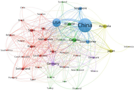 In order to determine the cooperative relationships among the major countries or regions involved in eCO2RR research, the country/region distribution of literature authors was analyzed. Authors from 77 countries/regions have published papers on eCO2RR. China had the largest number of publications, with 2561, accounting for 56.3% of the total, followed by the United States (20.4%), and Canada (5.4%), indicating that China plays an important role in eCO2RR research to a large extent. Figure 2 shows the cooperative relationship profile of the author’s country or region. As can be seen from Figure 2, China and the United States have the closest international cooperation and are the two countries most closely connected in the field of eCO2RR research. In addition, China also has closer international cooperation with Germany, Canada, and other countries.