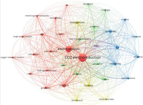 In addition to the general direction of “CO2 electroreduction”, electrocatalysts appeared the most in this cluster, linking 34 other nodes, which were closely related to the other clusters. Electrochemical catalysts play a very important role in the process of eCO2RR. There are many kinds of catalysts, and different types of catalysts have different selectivity for the products of eCO2RR.