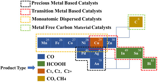 Precious/non-precious metal catalysts are the most used catalysts. Commonly used precious metal-based catalysts mainly include gold (Au), silver (Ag), platinum (Pt), palladium (Pd), etc. Most of the precious metal-based catalysts are involved in the electrocatalytic reduction of CO2 to CO, showing good conductivity and excellent CO selectivity [35,36].