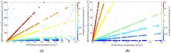 In Figure 1, the tritium concentration in the BB PHTS rooms is shown for different leak rates from the PHTS to the tokamak building as a function of the tritium concentration in the primary coolant. The PHTS rooms’ concentration is expressed as µCi m−3. For comparison, 1 MPC(a) corresponds to 10 µCi m−3 (100 MPC(a) is the threshold for the adoption of cumbersome air-suits during outage activities) and 1 Derived Air Concentration (DAC) of HTO is about 8 µCi m−3 (concentrations below 1 DAC allow operations without respiratory protection). Figure 1 shows that, under the assumed tritium concentration in the coolant, tritium inventory in the PHTS rooms is kept well below the threshold of 100 MPC(a), except for the two cases of higher leak rates, allowing operations of qualified personnel with respirators. If the goal is to limit the concentration in the PHTS rooms to below 1 DAC, Figure 1b shows that a concentration lower than 1 Ci kg−1 is required in the primary coolant if a realistic leak rate of 0.57 kg h−1 is considered from the PHTS to the tokamak building. The target PHTS concentration reduces to 0.3 Ci kg−1 assuming a leak rate of 1 kg h−1.