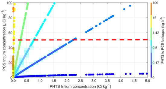 The high pressure (around 8.9 MPa) and high temperature (around 270 °C) of the primary cooling system are the principal contributors to the tritiated heavy water escape in a CANDU reactor (small chronic leakages and occasional spills), accounting for 80 ÷ 90 percent of total loss [,]. Nevertheless, considering the different tritium concentrations, the moderator is expected to contribute to 70 ÷ 80 percent of the total tritium emission (airborne and waterborne). On the other hand, the tritium release from the primary cooling system is the most relevant contributor to internal occupational exposures (around 80%), responsible for the increase of the overall maintenance cost due to the requirement for personnel protective equipment and procedures [].