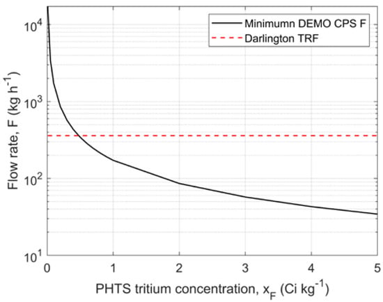 Assuming the aforementioned boundary conditions and a CPS efficiency equal to 100% (the whole tritium content into the CPS feeding stream is recovered), the needed CPS flow rate (F) is expressed as a function of the maximum tritium concentration target in PHTS (xF) in Figure 3.