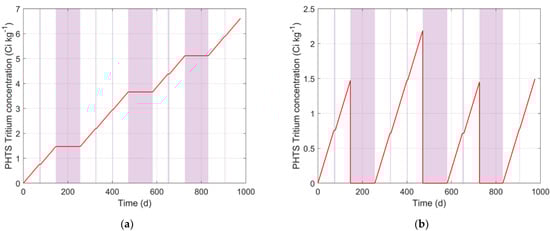 Increase of tritium concentration within primary coolant under assumed plasma operative sequence: (a) without CPS; (b) CPS off-line strategy, the whole PHTS water inventory is replaced with virgin water during in-vessel maintenance.