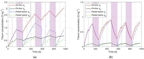 Increase of tritium concentration in primary coolant (xF) and in the distillate stream (xD) under assumed plasma operative sequence for the on-line (solid lines) and the partial hybrid strategy (dashed lines): (a) maximum target tritium concentration in PHTS of 5 Ci kg−1; (b) maximum target tritium concentration in PHTS of 1 Ci kg−1.