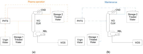 The water CPS full hybrid strategy: (a) flow diagram during plasma operation; (b) flow diagram during maintenance.