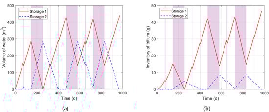 Operation of full hybrid water CPS under the assumed plasma operative sequence: (a) trend of water inventory into Storage 1 and Storage 2; (b) trend of tritium inventory into Storage 1 and Storage 2.