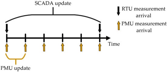 - Different sensor reporting rates and time-inconsistent data. The first aspect is that PMU measurements are updated at a much higher rate than RTU measurements. Furthermore, there is no coordinated timing of measurement arrivals between different data sources, referred to as the asynchronization or time-skew problem, which indicates that the field measurements will likely not form a dataset captured at an exact time instance. Apart from the uncoordinated timestamping of RTU data, time inconsistencies also occur due to different communication delays among sensors [12,13].
