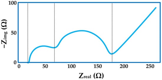 The usual form of plotting impedance data is a Nyquist plot where the resistance is displayed along the (real) x-axis and reactive components are displayed along the (imaginary) y-axis [], as depicted in Figure 1.