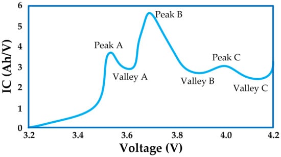 Therefore, it falls into the category of DA methods. As shown in Figure 2, this results in an incremental capacity (IC) curve where the following IC metric points can be defined: peaks, valleys and voltage values.