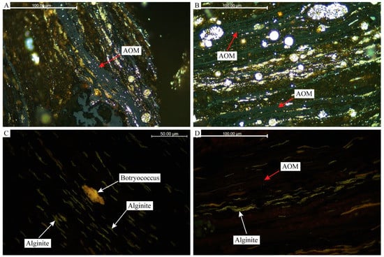 - Kus, J.; Araujo, C.V.; Borrego, A.G.; Flores, D.; Hackley, P.C.; Hámor-Vidó, M.; Kalaitzidis, S.; Kommeren, C.J.; Kwiecińska, B.; Mastalerz, M.; et al. Identification of alginite and bituminite in rocks other than coal. 2006, 2009, and 2011 round robin exercises of the ICCP Identification of Dispersed Organic Matter Working Group. Int. J. Coal Geol. 2017, 178, 26–38. [Google Scholar] [CrossRef]
