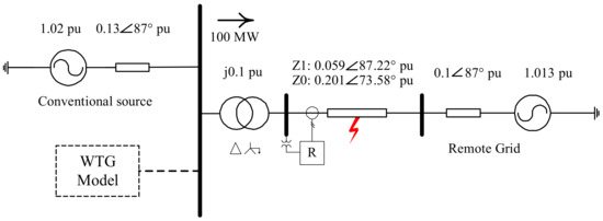In the second case, the conventional source was replaced by a Type IV WTG model. The WTG was modeled in the simulation as an averaged model using generic DQ frame current controls. The LVRT (low-voltage ride-through) strategy and other peripheral controls were based on the guidelines outlined in the IEC 61400-27-1 standard [29]. The general behavior of the WTG model was verified with those available in the published literature [1,2]. In both cases, the source was pushing 100 MW of active power at a unity power factor to a remote grid (which is also represented as a voltage source behind an impedance) via a short transmission line.