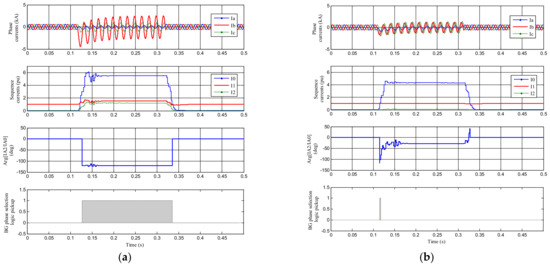 (a) Results for faulted phase selection for a BG fault at the mid-point of the line with the conventional source. Results for faulted phase selection of a BG fault at the mid-point of the line with the WTG model, (b) Results for faulted phase selection of a BG fault at the mid-point of the line with the WTG model.