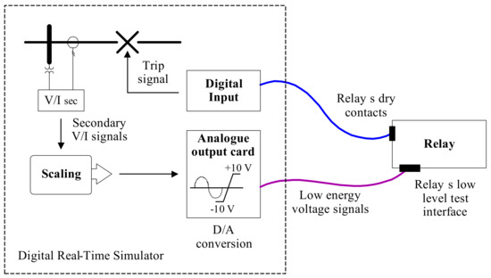 As shown in Figure 5, the power system was simulated in the DRTS, and both line protection relays were interfaced using low-energy analog signals and the relay’s dry contacts. High-resolution digital waveforms (secondary voltage and current transformer outputs) generated in the simulation were converted to low-energy analog voltage signals (<±10 Vpp) by the analog output card of the DRTS, which were then fed to a low-level test interface of the relays. Scaling factors for the analog output card were accurately determined in order to provide precise low-level voltages to the low-level test interface of the relays under test.