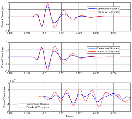 Band-pass filtered phase currents for an AB fault at 5% of the line with a conventional source and a Type IV WTG system.