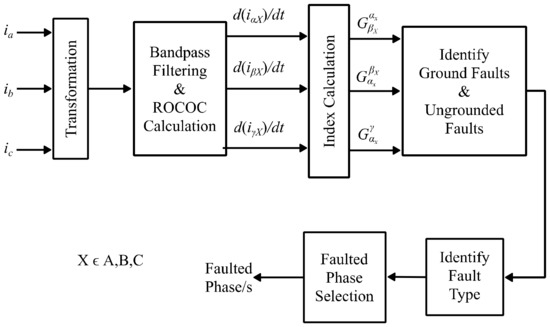 Upon detecting a fault, nine fault discrimination indices are computed, taking different ratios of the maximum rates in the change in current (ROCOC) of these filtered current components. More details of the rationale and definitions of these indices can be found in [21]. The process of identifying the fault type and faulted phases are summarized in Figure 7.